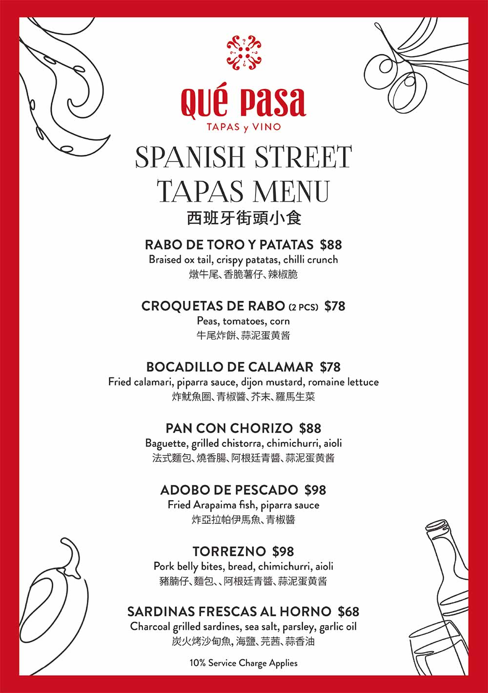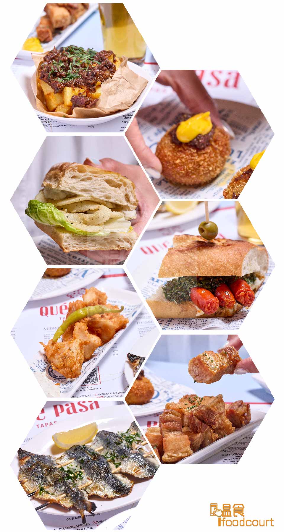 Qué Pasa 街頭Tapas菜單串連西班牙各大地區的風味,無論是隨意進店小酌,還是圍桌共享一頓豐盛的Tapas晚餐,皆能盡興而歸。紅酒燉牛尾配脆薯 HK$88 、燉牛尾可樂餅 HK$78(兩件)、炸魷魚包 HK$78、法包配烤Chistorra辣肉腸 HK$88、炸海象魚柳配Piparra醬 HK$98、脆炸五花腩配麵包 HK$98、炭烤沙甸魚 HK$68,每道菜式均精心設計,與 Qué Pasa 的解暑雞尾酒及啤酒完美搭配,無論是隨意進店小酌,還是圍桌共享一頓豐盛的Tapas晚餐,皆能盡興而歸。