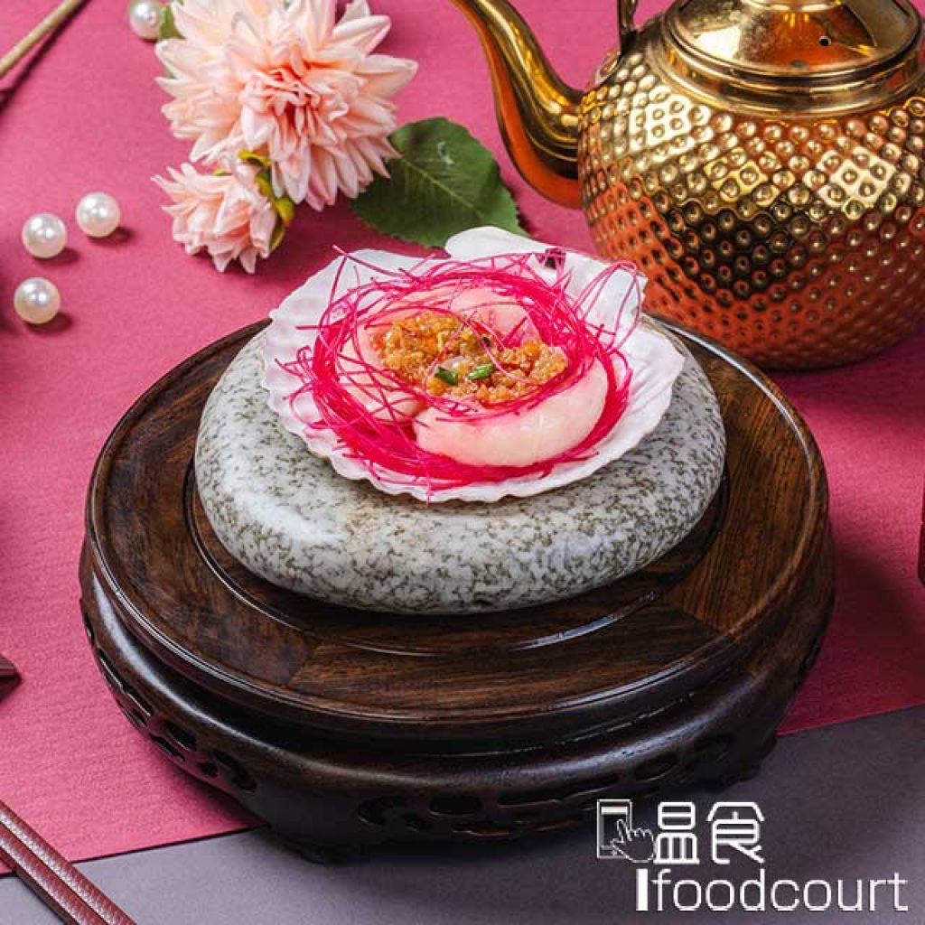 紅娘金玉帶:日本刺身級帶子淋蒜蓉辣椒醬,底層粉絲以紅菜頭天然提色,吸滿鮮甜精華,色澤艷麗、滋味層次豐富。