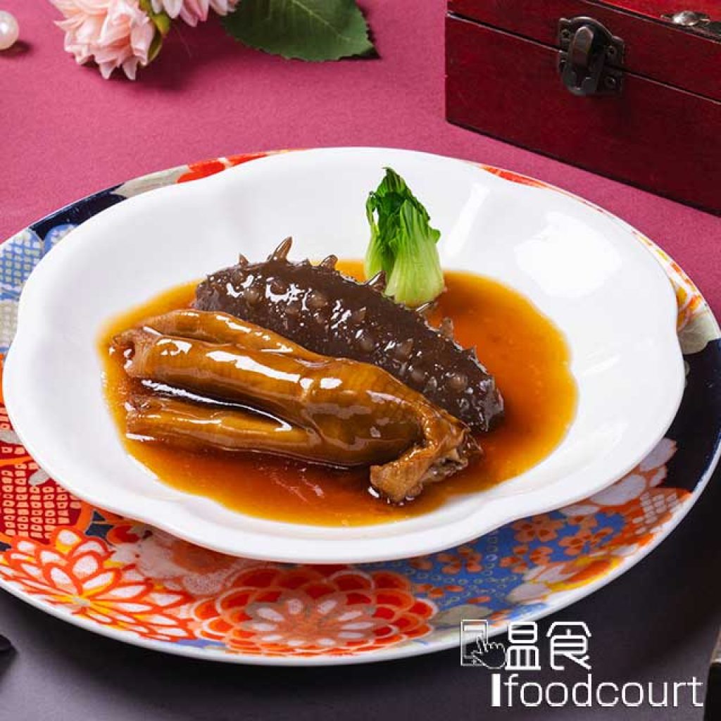 溏心吉品乾鮑魚拼脆皮海參:溏心鮑魚以老雞、三黃雞、金華火腿等層疊食材熬製秘製醬汁,鮮味豐盈。