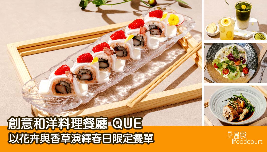 花香與和洋料理相遇,餐桌之上便綻放出屬於春日的詩意風景。創意和洋料理餐廳 QUE 以「花香草韻」為今季主題,將於 2026 年 3 月 20 日推出全新期間限定餐單及「春日祈願」活動。以多種食用花卉、香草及當造水果入饌,將花卉的馥郁芬芳與香草的清新氣息巧妙融入和洋料理之中。透過細膩的色彩佈局、層層交織的香氣與豐富味覺層次,呈現一場兼具視覺美感與味覺享受的春日饗宴。